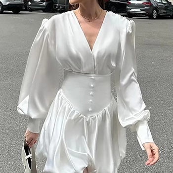 Enyami Chic Fashion Leisure 100% Cotton Col en V Lacets Manches bouffantes Boutons taille haute Blanc Robe trapèze pour femme